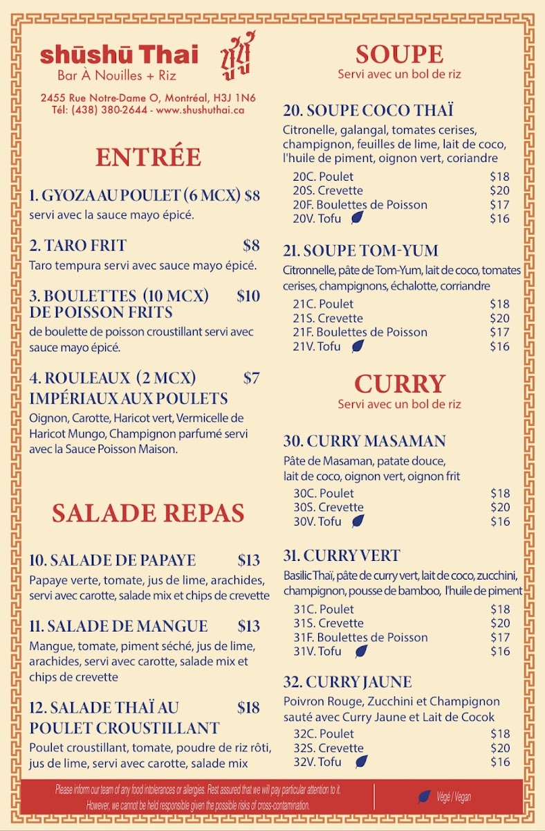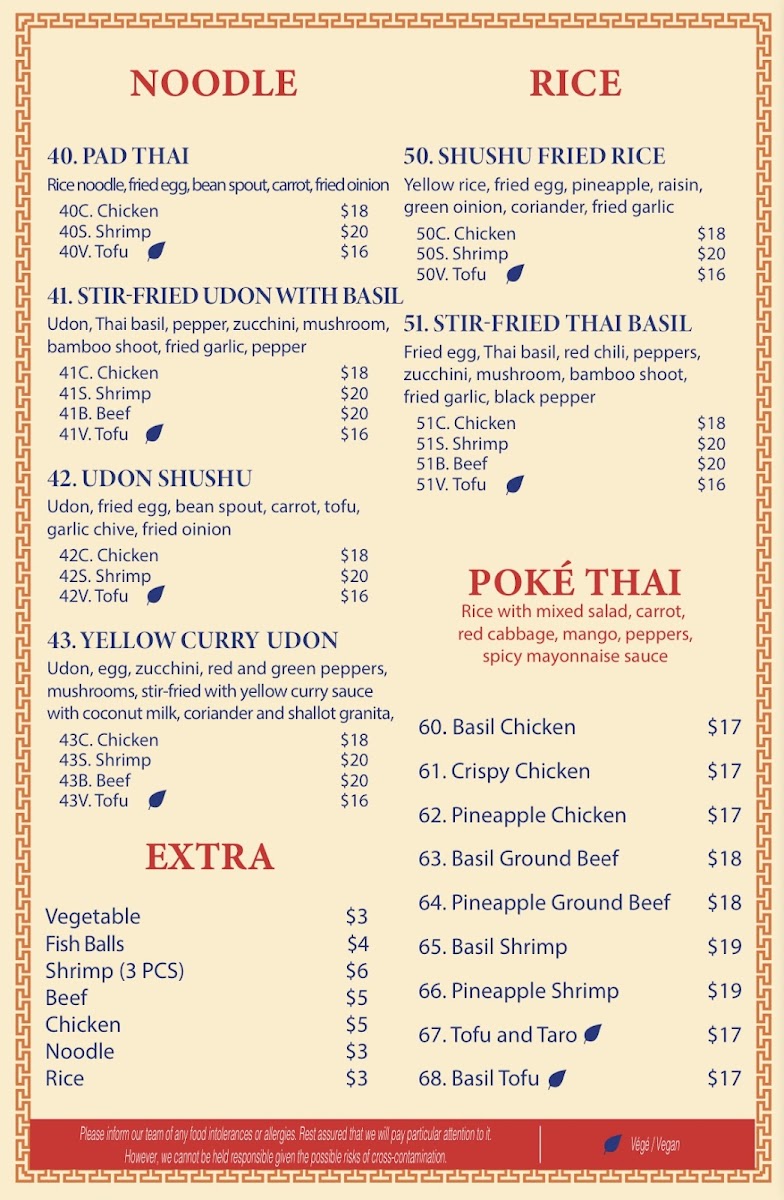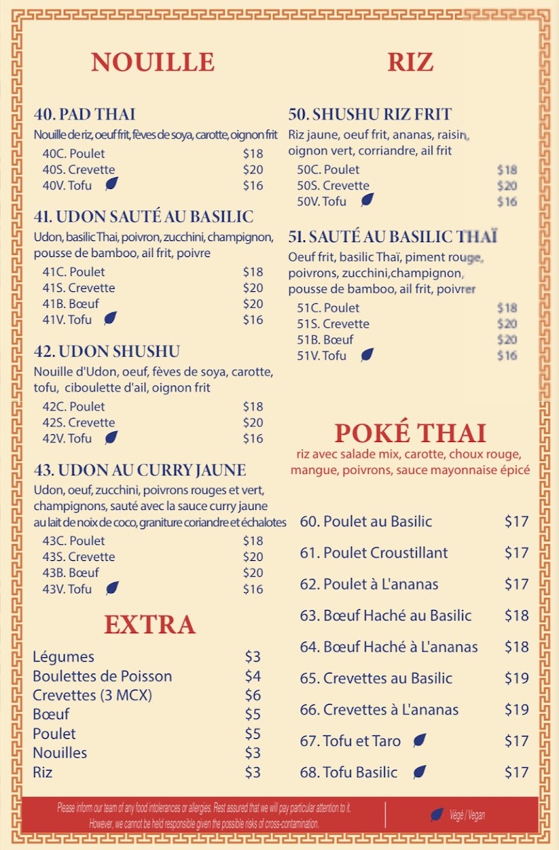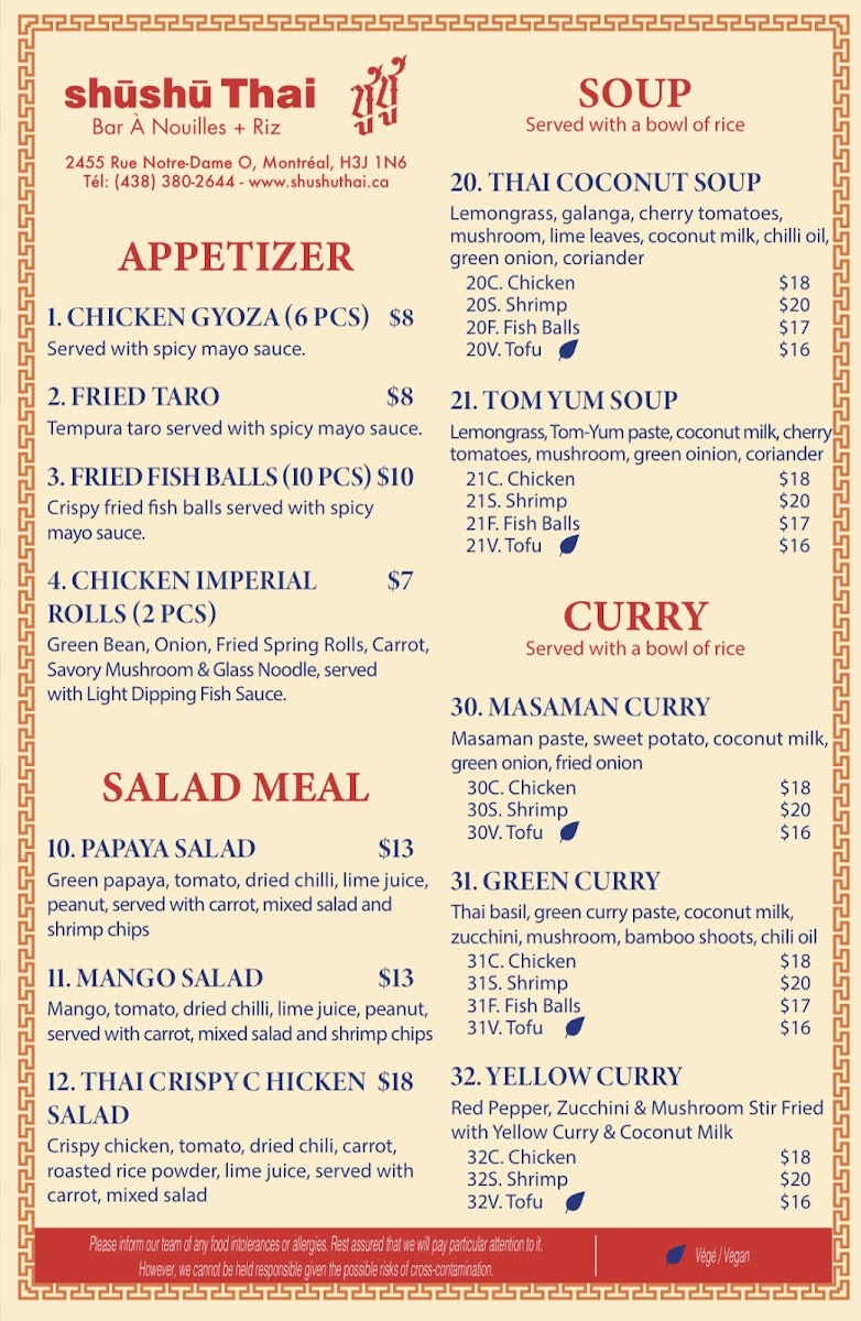 Shushu Thai Bar À Nouille + Riz offers a diverse menu that brings a delightful blend of Thai and Asian flavors. For appetizers, you can choose from the crispy Goong Hom Pha (3 pieces), savory Gyoza Vege or Gyoza Poulet (6 pieces), and comforting soups like the Tom Yum Soup and Tom Kha Soup. The drink selection includes refreshing options like Coconut Juice, Lychee Juice, and the classic Canada Dry, alongside sodas like Coke. For those looking to enhance their meals, extras such as Steamed Rice, Extra Fried Egg, or Extra Shrimps (3) are available. The menu also features vibrant salads, including the zesty Som Tum Salad and the fresh Salade De Mangue. Rice lovers can indulge in Khao Phad Thai Style or the flavorful Pad Kra Pao, while noodle dishes like Pad Thai, Khao Soi, and Pad Kra Pao Udon are sure to satisfy any cravings. For curry enthusiasts, options like Green Curry, Massaman Curry, and Yellow Curry offer a rich and aromatic taste of Thai cuisine. Each dish combines authenticity with fresh ingredients, making Shushu Thai Bar À Nouille + Riz a great destination for a flavorful and satisfying meal.