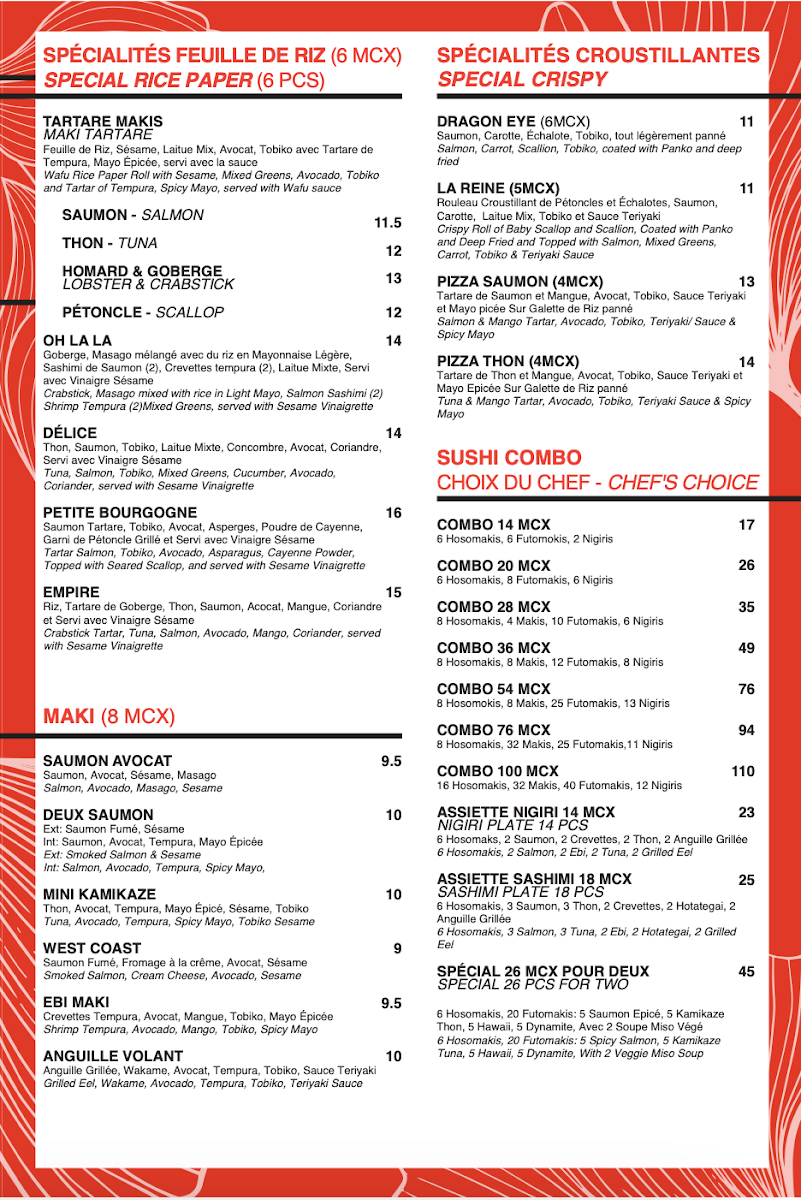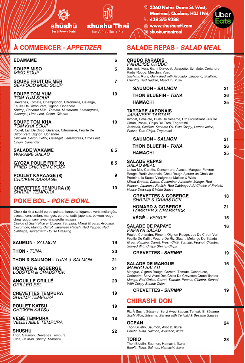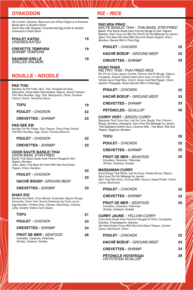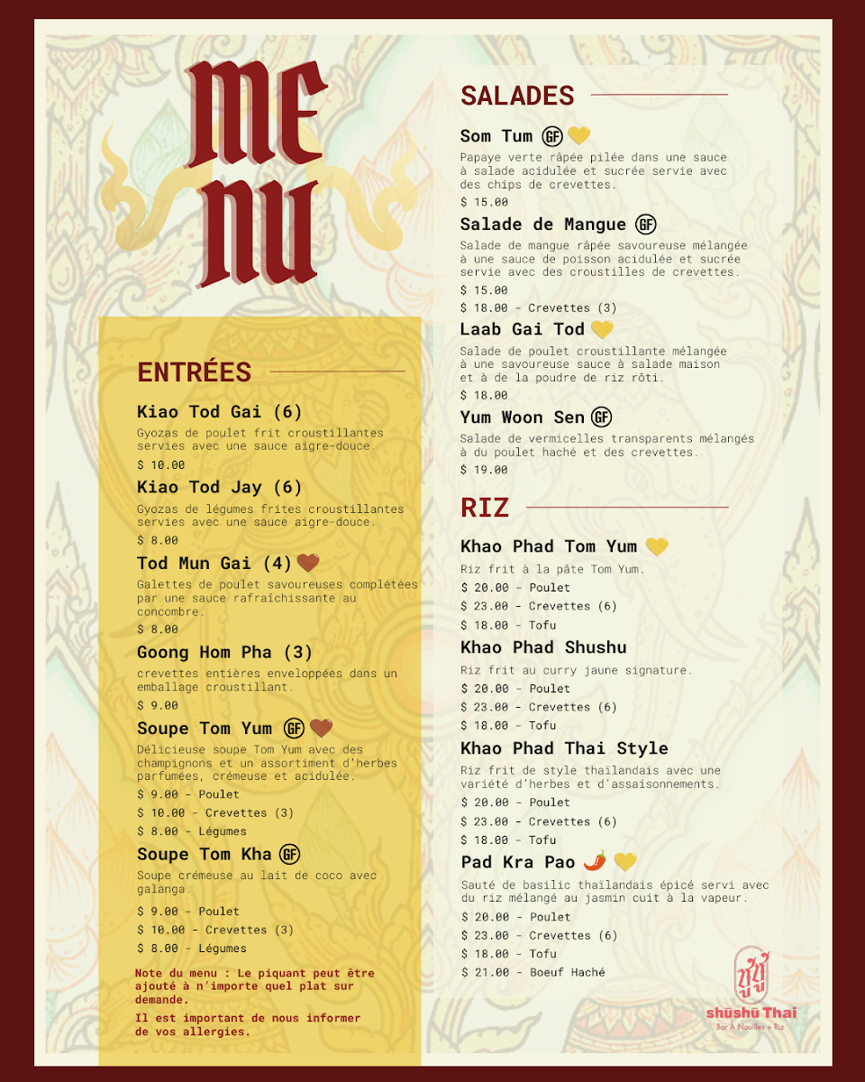 Shushu Thai Bar À Nouille + Riz offers a diverse menu that brings a delightful blend of Thai and Asian flavors. For appetizers, you can choose from the crispy Goong Hom Pha (3 pieces), savory Gyoza Vege or Gyoza Poulet (6 pieces), and comforting soups like the Tom Yum Soup and Tom Kha Soup. The drink selection includes refreshing options like Coconut Juice, Lychee Juice, and the classic Canada Dry, alongside sodas like Coke. For those looking to enhance their meals, extras such as Steamed Rice, Extra Fried Egg, or Extra Shrimps (3) are available. The menu also features vibrant salads, including the zesty Som Tum Salad and the fresh Salade De Mangue. Rice lovers can indulge in Khao Phad Thai Style or the flavorful Pad Kra Pao, while noodle dishes like Pad Thai, Khao Soi, and Pad Kra Pao Udon are sure to satisfy any cravings. For curry enthusiasts, options like Green Curry, Massaman Curry, and Yellow Curry offer a rich and aromatic taste of Thai cuisine. Each dish combines authenticity with fresh ingredients, making Shushu Thai Bar À Nouille + Riz a great destination for a flavorful and satisfying meal.